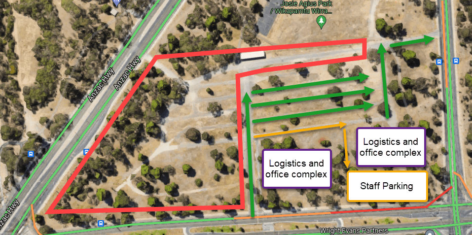 - When capacity in the Park 22 red zone is reached, the overflow area is Park 23 (western side of Anzac Highway). Please note that this has one entry only (southern end of Park 23) and one exit only (northern end). If using this space, please exercise extreme caution crossing Anzac Highway, and it is highly recommended that families with children in particular only cross at the pedestrian crossing. In fact, it’s good advice for adults too.